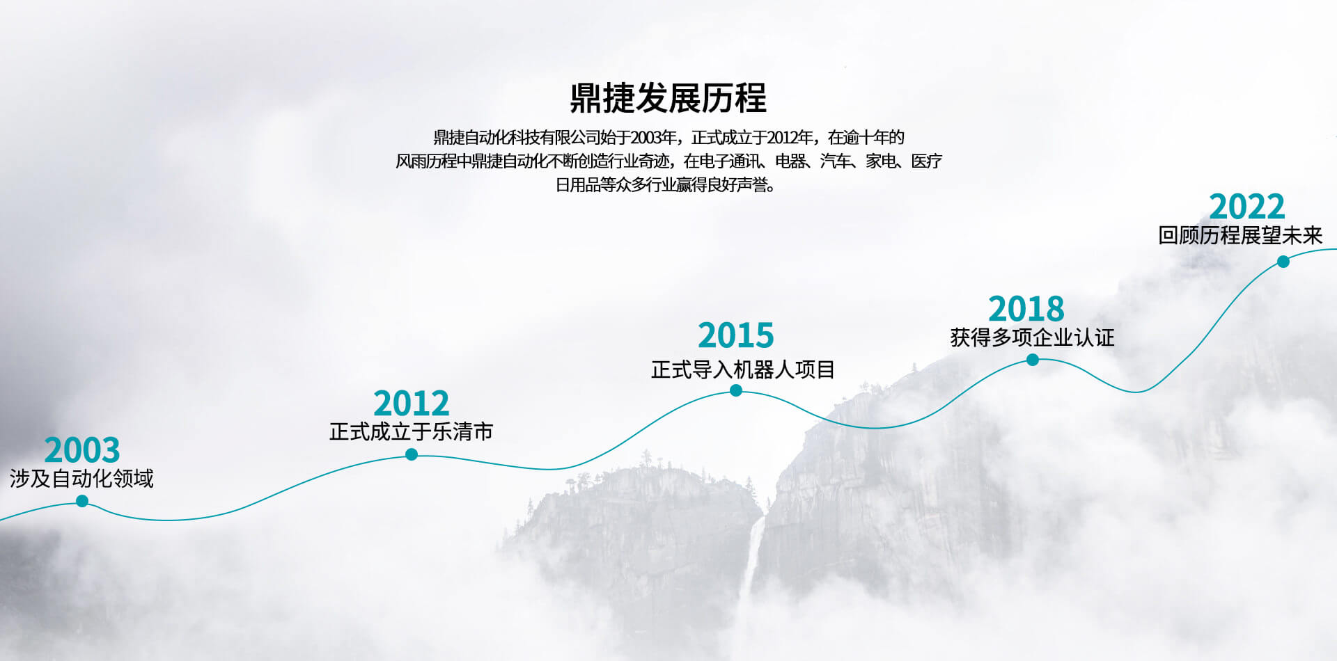 公司始于2012年,在逾十年的風(fēng)雨歷程中,不斷創(chuàng)造行業(yè)奇跡,在電子通訊、電器、汽車、家電、醫(yī)療、日用品等眾多行業(yè)贏得良好聲譽(yù)。公司坐落于浙江省樂(lè)清經(jīng)濟(jì)開發(fā)區(qū),現(xiàn)有人員63人,擁有經(jīng)驗(yàn)豐富的工程技術(shù)研發(fā)團(tuán)隊(duì)11人,其中高級(jí)工程6人,具備本科以上學(xué)歷高級(jí)工程人員比例78%;同時(shí)鼎捷自動(dòng)化在蘇州,東莞等地設(shè)立分公司以服務(wù)目標(biāo)市場(chǎng)客戶,目前鼎捷自動(dòng)化已經(jīng)為下客戶提供配套自動(dòng)化解決方案:泰科、安費(fèi)諾、莫士、華為、中興、普聯(lián)、智英、意華、德豐、公牛、萬(wàn)事達(dá)、華豐、飛雕、普思、冠聯(lián)、俊朗松田、進(jìn)聯(lián)、高正、盛凌等。鼎捷自動(dòng)化專業(yè)從事連接器、開關(guān)及相關(guān)電子、電器、五金、塑膠產(chǎn)品組裝自動(dòng)化定制、設(shè)計(jì)、制造、銷售。2012年,鼎捷自動(dòng)化正式導(dǎo)入機(jī)器人應(yīng)用項(xiàng)目,可為各類客戶提供電子、電器、汽車、五金、塑膠等集成自動(dòng)化智能組裝系統(tǒng)。